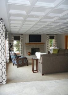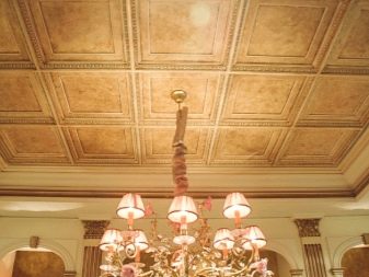 - بالنسبة للسقف المغلف ، من الأفضل اختيار بلاط خشبي مثقب مع فترات استراحة زخرفية وخلايا مشكلة ؛