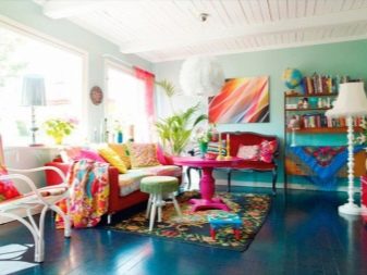 - أسلوب بوهو هو النقيض المطلق لخيارات التصميم السابقة. يجدر الاختيار لصالح الألوان الأكثر سطوعًا ، فالأثاث الأبيض أو الأسود البسيط ليس مناسبًا تمامًا لمثل هذه التصميمات الداخلية. ومع ذلك ، يمكنك استخدام عناصر الضوء “لتخفيف” السطوع الواضح قليلاً..