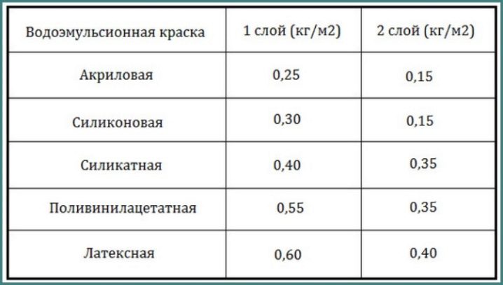 يبلغ استهلاك الصبغة المائية حوالي 210 مل من المادة لكل 1 متر مربع. م من المنطقة المراد طلائها. لكن هذا معنى مشروط ، منذ ذلك الحين يميل المؤشر إلى التغيير وفقًا لنوع السطح وطريقة التخفيف والظروف الأخرى. الوزن المحدد للطلاء لا يفترض أكثر من 1.5 كجم.