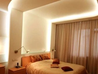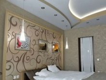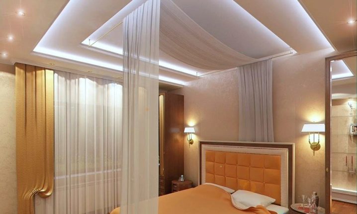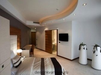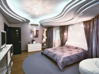 ولكن حتى في غرفة النوم الصغيرة ، هناك خيارات لسقف متعدد المستويات سيبدو رائعًا. ومع ذلك ، يجب أن يحتوي هذا التصميم على خطوط ناعمة ، ويجب ألا تبرز الخطوة الثانية كثيرًا من سطح الأول.