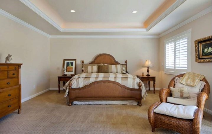 - سقف متدرج فاخر لغرفة نوم واسعة. يسمى السقف في هذا النمط بالارتفاع..