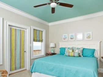 - أزرق. حل جيد للسقف في غرفة النوم. سيكون مفيدًا بشكل خاص في الغرف المنخفضة. سوف يوسع اللون السماوي المساحة بصريًا ، مما يمنحها إمكانية الوصول والصفاء. ومع ذلك ، فإن هذا اللون بارد ، لذا قم بتخفيفه بعناصر زخرفية زاهية بألوان دافئة..