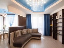 - تقسيم الغرفة. بمساعدة التصميم الأصلي للنسيج المرن ، يمكنك تقسيم الغرفة. يمكن أن يتضمن التصميم طباعة مذهلة لإبراز وسط الغرفة. سيسمح لك السقف في عدة طبقات بتقسيم المساحة إلى عدة مناطق.