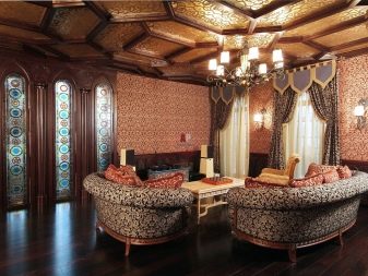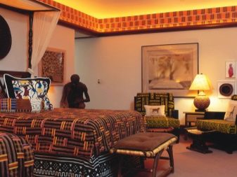 لتجسيد النمط العرقي الديكور ذو الألوان الرملية والبنية مثالي ، ويمكن أن يتنوع نسيج غطاء السقف. في النمط العرقي ، يمكن استخدام خيارات فردية ومتعددة المستويات. اللوحات المرسومة تبدو رائعة.