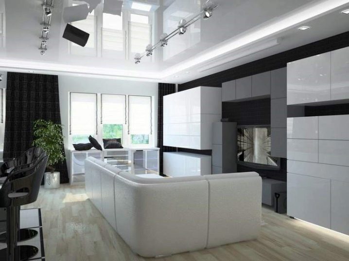 للديكور الداخلي مرحبا التكنولوجيا اللمعان الرائع يجعل السقف اللامع مثاليًا. عند اختيار اللون ، يجب أن تعطي الأفضلية للنغمات الرمادية ، على الرغم من أن إصدار بياض الثلج يبدو أيضًا مربحًا للجانبين. بناءً على طلب العميل ، يمكن استخدام الرسم المذهل كديكور..