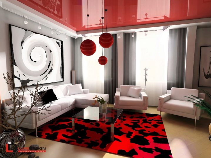 يبدو الجمع بين الأحمر والأسود والأبيض في داخل غرفة المعيشة مثيرًا للإعجاب وجريءًا. يزيد القماش الأحمر اللامع بصريًا من ارتفاع السقف الأساسي. يبدو الهيكل متعدد المستويات ذو الشكل الجيد مثيرًا للإعجاب على عكس الثريات المستديرة ذات الأشكال المختلفة والسجاد المرقط.