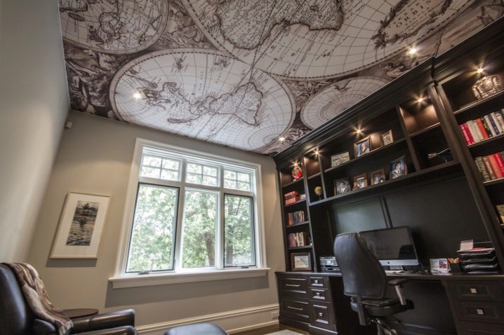 سيكون السقف الممتد مع طباعة الصور خيارًا ممتازًا لتزيين الدراسة. تؤكد صورة خريطة العالم على الغرض من المكتب ، وتمنح الأناقة الداخلية والرفاهية.
