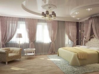 إبراز الداخل في أسلوب بساطتها سيسمح بسقف لامع أحادي اللون. تبدو خيارات الساتان بألوان الباستيل جميلة. بساطتها لا تتسامح مع التجاوزات والديكور ، لذلك من الأفضل استخدام خيارات أحادية اللون.