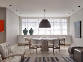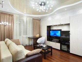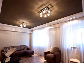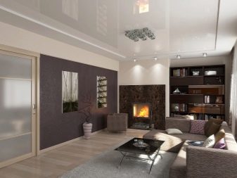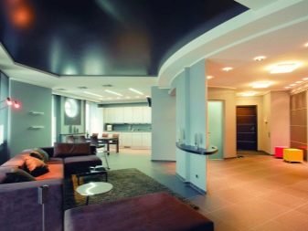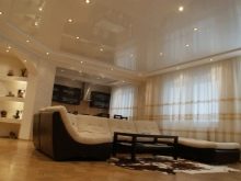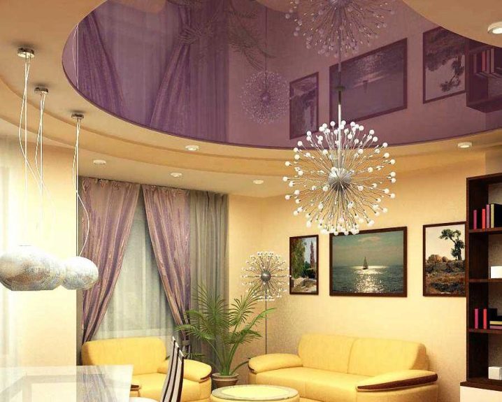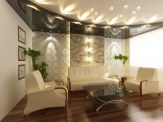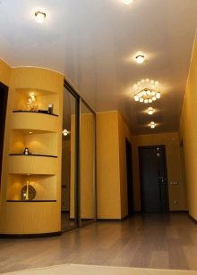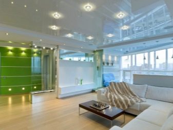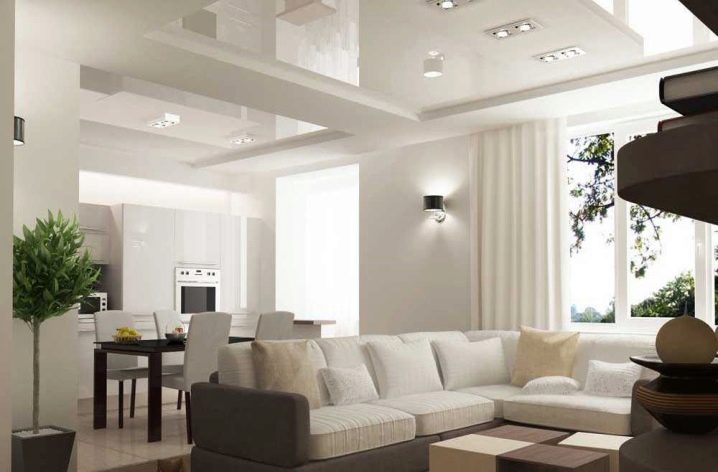 لتجنب التصور السلبي ، يجدر تقليل عدد التفاصيل الداخلية.. هذا سوف يملأ الغرفة بالهواء والخفة. يسمح لك التضمين الجزئي لللمعان في تصميم السقف بإدخال تنظيم غير مزعج في أي غرفة ، وتحديد منطقة وظيفية منفصلة للمساحة بوضوح. على سبيل المثال, عن طريق اللمعان ، يمكنك تحديد منطقة تناول الطعام ، وتسليط الضوء على منطقة الطهي ، وإبراز منطقة الملابس في الردهة. في الوقت نفسه ، من المنطقي اختيار ظل دافئ: نغمات باردة من اللمعان تجعل الغرفة غير مريحة.