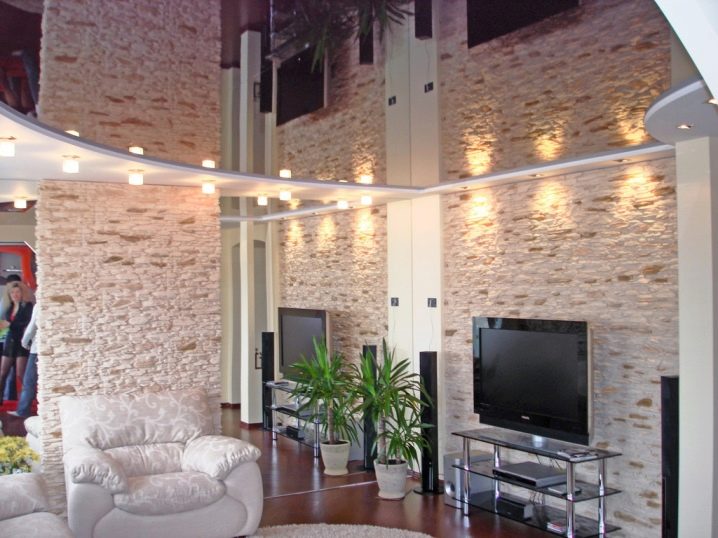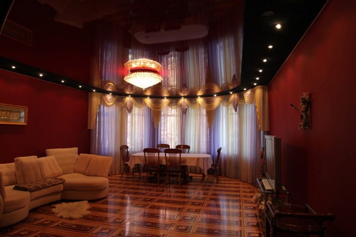 من المستحيل عدم ملاحظة تأثير تأثير المرآة على الإدراك. يبدو هذا السقف أنيقًا ، لكن السطح يعكس كل شيء أدناه. حيث كلما كانت نغمة المادة أغمق ، كلما كان تأثير المرآة أكثر تعبيرًا. وهنا يطرح سؤال آخر بالفعل: السقف سيضاعف عدد قطع الأثاث في غرفة معينة ، وهو أمر محفوف بالتأثير البصري للفوضى وفقدان أسلوب التصميم..