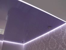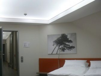 بمساعدة إضاءة LED المبنية حول المحيط ، يتم إنشاء التأثير على أن السقف لا يلمس الجدران ، ولكنه معلق في الهواء. تقنية التصميم هذه ليست جذابة في المظهر فحسب ، بل تسمح لك أيضًا بإخفاء مفاصل القماش بالجدار..