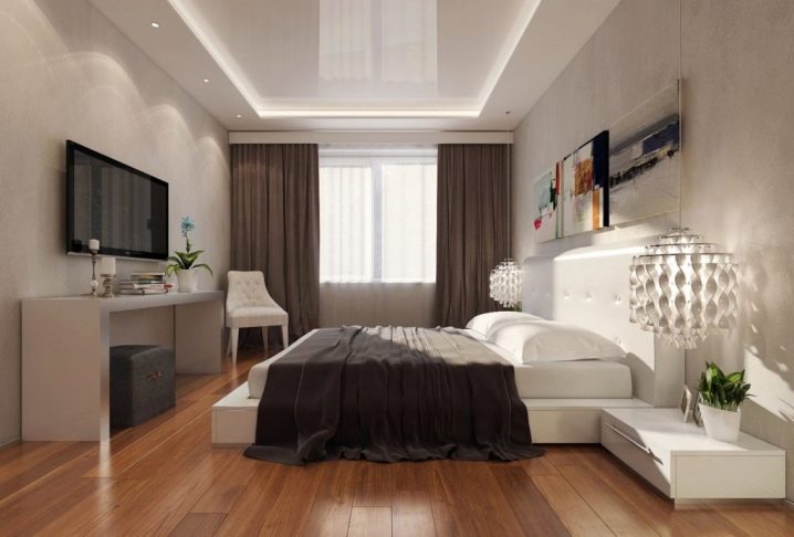 لتزيين السقف بأسلوب عصري في الشقة ، يمكنك استخدام اللون الأبيض البسيط ، والذي يبدو جيدًا في أي ديكور داخلي تقريبًا.