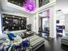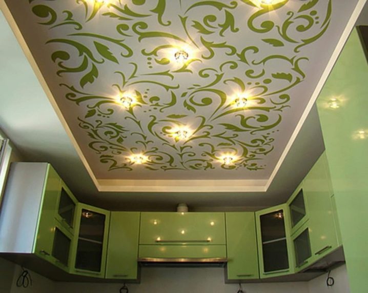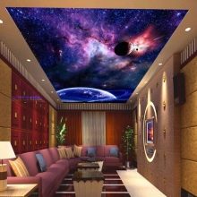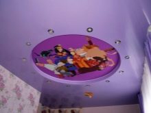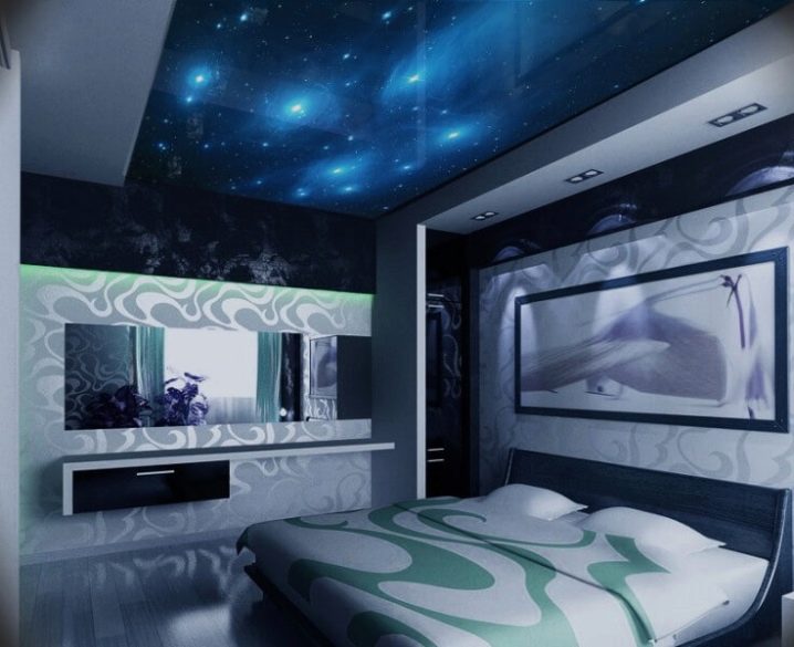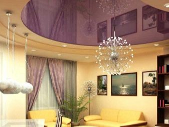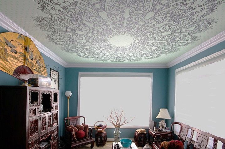 تبدو الأسقف الممتدة مع طباعة الصور على شكل أنماط ورسومات مختلفة مثيرة للاهتمام في الداخل. يتيح لك هذا الحل إنشاء تباين معين وإضفاء لمسة غير عادية على الداخل ، والتي لا تجذب الكثير من الاهتمام..