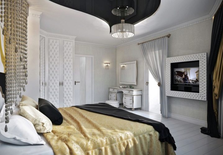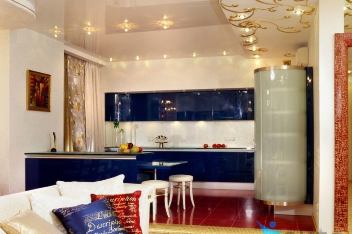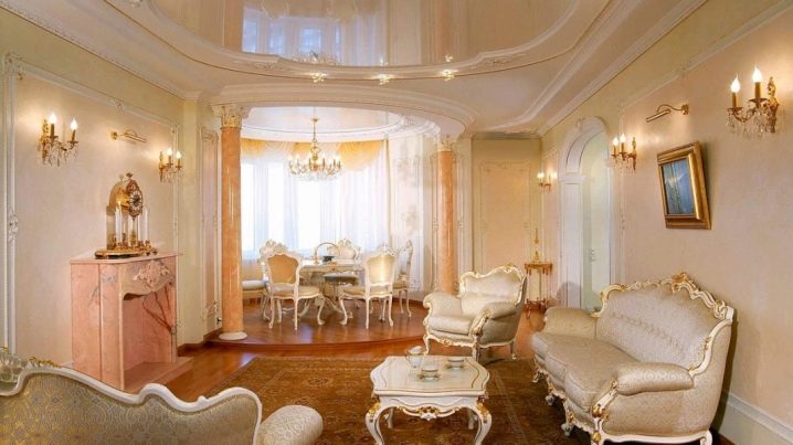في هذه الحالة ، يمكنك استخدام سقوف غير لامعة ، مزينة حول المحيط بأكمله بجص محكم مع طلاء بالذهب..