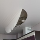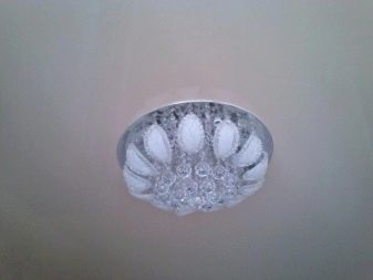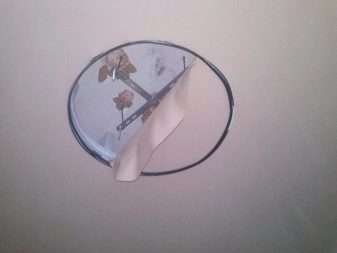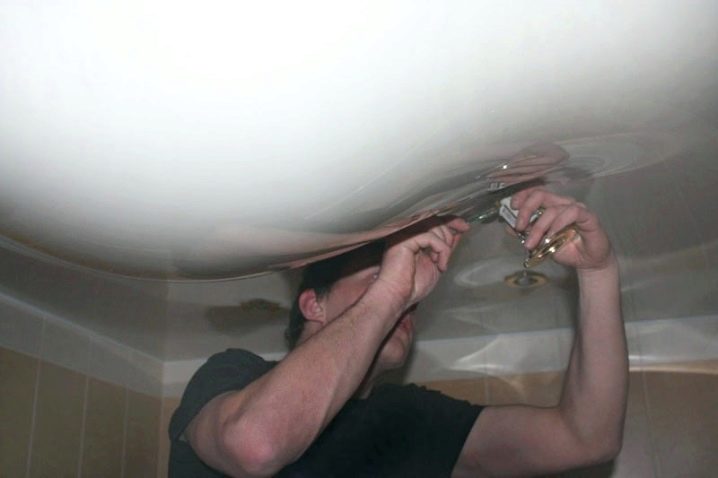إذا تشكلت فتحة في القماش اللامع ، فيمكن تركيب مصباح أو عنصر زخرفي آخر في مكانه. في هذه الحالة ، يتم قطع الفيلم تحت حلقة بلاستيكية خاصة ، يتم تثبيت العنصر المحدد بداخلها.