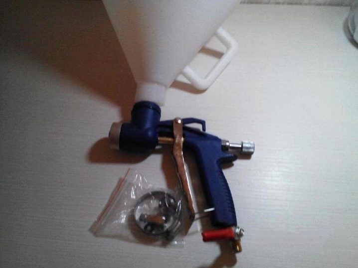 الجهاز يشبه زجاجة رذاذ مع قمع ضخم في الأعلى ، لكنه يختلف عنه في طريقة عمله. يعمل مع ضاغط يولد ضغطًا ، وبالتالي يتم تطبيق طبقة الجص بشكل متساوٍ.