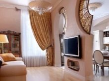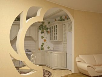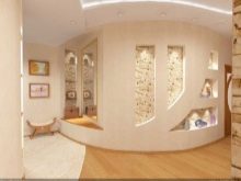 تم تصميم الشقة بالكامل بمشاركة دريوال. تقسيم المناطق مع الأقواس والأرفف والسقف – كل شيء مصنوع بشكل جميل من هذه المواد.