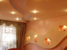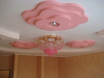 عندما تكون أجزاء الحوائط الجافة جاهزة ، يجب عليك تحديد السقف أو الجدار ، مع تحديد مواقع السحابات الداعمة. يجب ألا تقل المسافة بين الطبقات والسقف عن 8 سم للتهوية وتركيب تركيبات الإضاءة. يتم تثبيت الأسلاك الخاصة بالمصابيح والإطار من الملف الشخصي في نفس الوقت. يمكن جعل بتلات الزهور حجمية (المسافة البادئة من الطبقة الأولى) أو في مستوى واحد ، كل هذا يتوقف على قرارات التصميم.