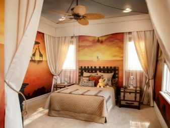 إذا نظرنا إلى تصميم السقف الأفريقي ، يمكن ملاحظة عدد من الميزات. في بعض الأحيان يتضمن التصميم استخدام عوارض كاذبة للخشب الداكن على مسافة 50 سم من بعضها البعض ، يمكنك تزيين الحوائط الجافة بالطلاء المائي أو ورق الحائط العادي ، إذا كانت فكرة التصميم تتطلب ذلك. تقليد ساق الخيزران أو القصب هو موضع ترحيب.