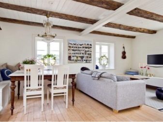 إلى حد كبير ، يستخدمون ألوان الباستيل والبيج أحادية اللون ، وكذلك الأبيض.. يحاولون عدم تضمين الأشكال المعقدة في التصميم.: هنا غالبًا ما يتم استبدالها بالحزم ، وهي سمة من سمات أسقف العلية في المنازل الخاصة. لا يُسمح باستخدام الثريات لتزيين الهياكل إلا إذا كان السقف مرتفعًا جدًا.