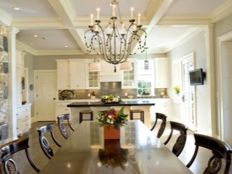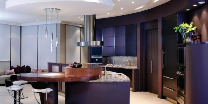 البساطة موضع ترحيب هنا. كما هو الحال في غرفة الأطفال ، فإن المكان مليء بالأشياء الصغيرة بالإضافة إلى الأثاث الرئيسي.. مستويان سيكونان كافيين. في هذه الحالة ، يمكن أن تكون الخطوط مجعدة أو صارمة. يُسمح بالإدخالات الديناميكية, تسليط الضوء على طاولة البار ، ومنطقة الطهي ، ومساحة لتناول الطعام.