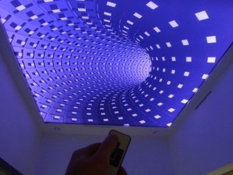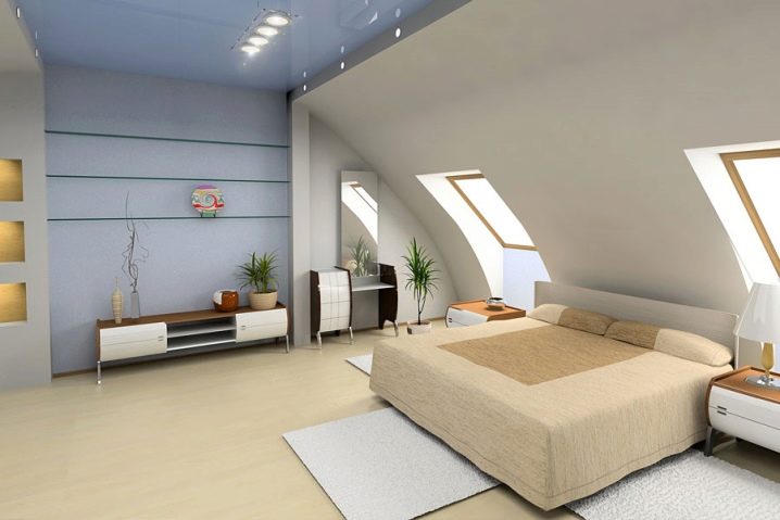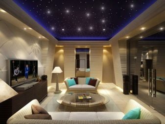 مطلوب إضاءة غير عادية كافية. إذا لم يكن هناك الكثير من الأشياء في الغرفة ، يمكنك إنشاء تشطيب من عدة مستويات أو سقف ملون عائم.