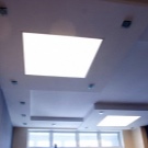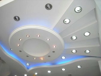 تحل الألواح محل الثريات تمامًا. يمكن أن يكون شكلها مستديرًا أو مربعًا. باطن الأرض عبارة عن أضواء كاشفة صغيرة مؤطرة بجسم ذهبي أو فضي. نتيجة لهذا ، فإنها تتناسب بنجاح مع أي تصميم أسلوبي لأسقف اللوح الجصي.