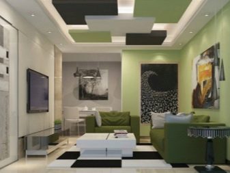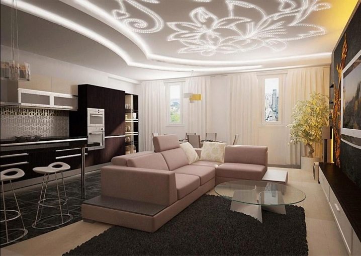 - اعتمادًا على تصميم الهيكل ، يمكنك وضعه في أي نمط داخلي. سقوف الجبس متناغمة في أي مساحة وتصميم ، بما في ذلك مخطط مفتوح مع مجموعة من جميع الغرف.