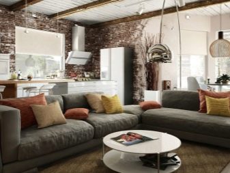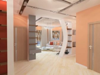 في مثل هذه الشقق ، يتم دمج جميع المناطق الوظيفية في مساحة مشتركة. لا يمكنك تقسيمهم بشكل حاد. من الأفضل استخدام هيكل واحد مع اثنين من اللوح الجصي في تصميم واحد.