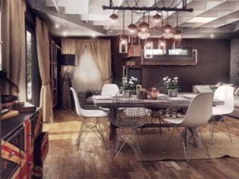 يجب أن يبدو كل شيء كما لو كنت هنا مؤخرًا. الملمس هو الأفضل غير لامع. يُسمح بتقليد الجير. الجرونج أكثر إرضاءً بشأن الزخرفة. لذلك ، يمكنك اختيار أضواء كاشفة أو ثريا سرية لتزيين السقف..