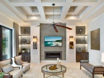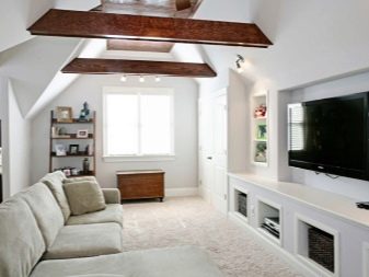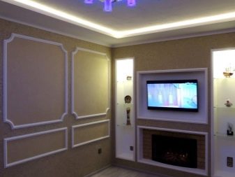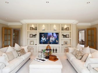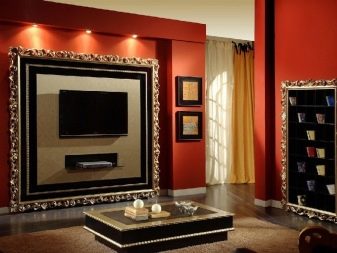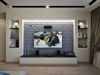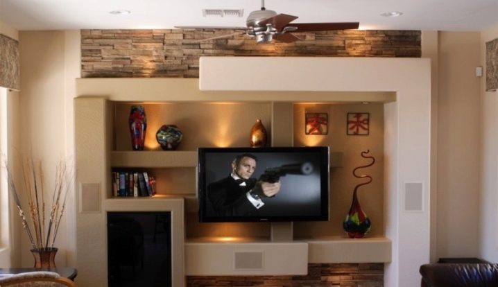 ليس من الضروري عمل أرفف إضافية لتخزين الأشياء أو تزيين الغرفة. كل هذا يتوقف على التفضيلات الفردية لأصحاب المنزل. وبالتالي ، سيبدو الهيكل وكأنه صندوق ، سيتم تثبيت تلفزيون في منتصفه..
