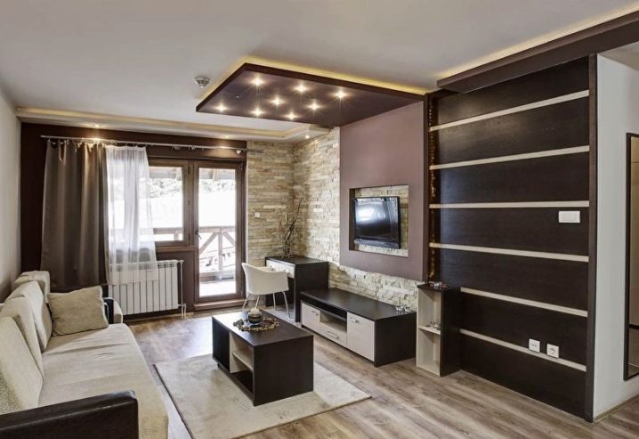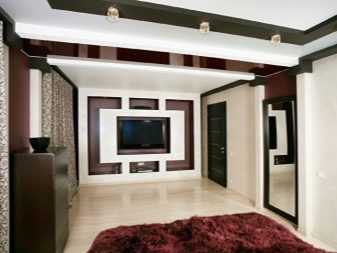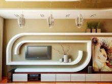 - مكانة التلفزيون الجصي مع رف واحد. كديكور ، يتم استخدام لوحة على السقف ، وهي مزودة بمصابيح مدمجة..