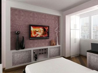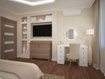 إذا تم تثبيت مكان مخصص للتلفزيون في غرفة النوم ، فعليك اختيار ألوان دافئة ولطيفة وخفيفة للزينة. هذا لن يشعر بازدحام الفضاء. كقاعدة عامة ، يتم تخصيص غرفة صغيرة لغرفة النوم. لهذا السبب يجب أن تصنع مكانة ذات حجم متوسط أو حتى صغير. في هذه الحالة ، سيكون زوجان من الأرفف كافيين كمساحة تخزين إضافية..