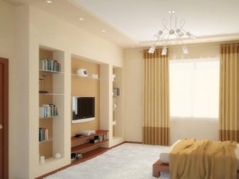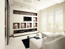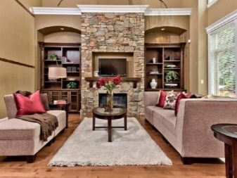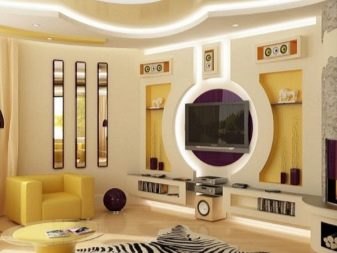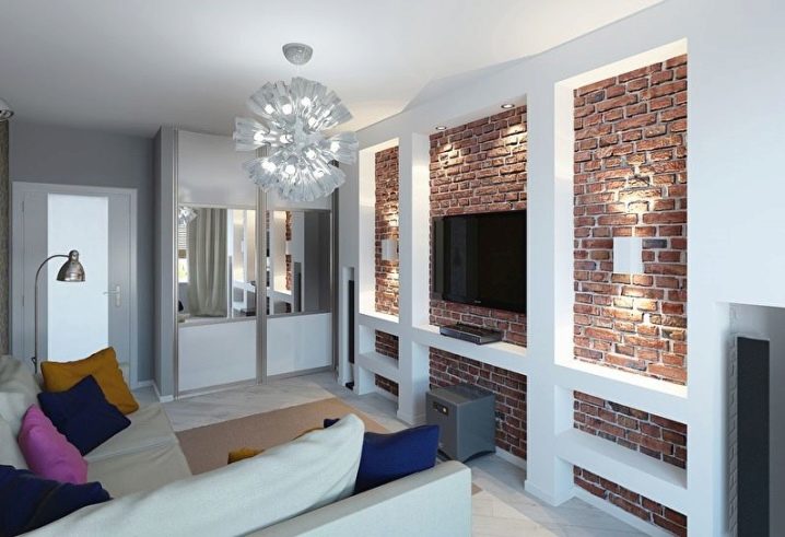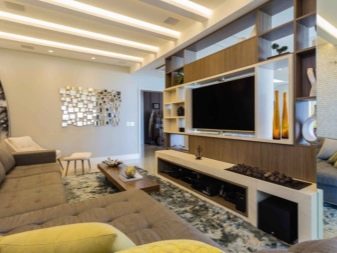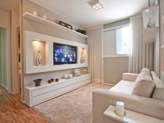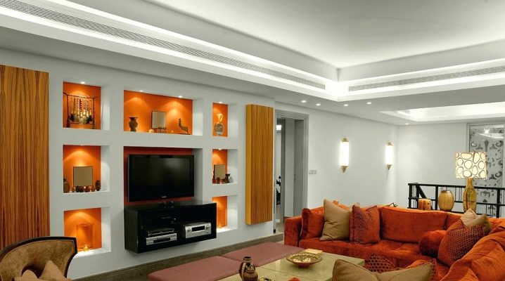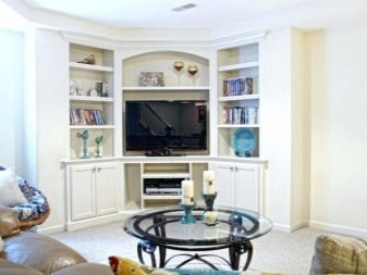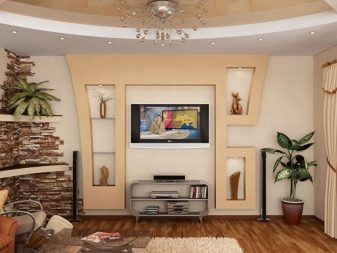 - بناء الجصي. إنه يشبه جدارًا إضافيًا به أرفف ضخمة ومكان للتلفزيون. عادةً ما تكون الأرفف مفتوحة وتستخدم للزينة. على سبيل المثال ، تم تثبيت العديد من التماثيل والزهور والصور والأشياء الصغيرة الأخرى التي ستسعد العين ببساطة..
