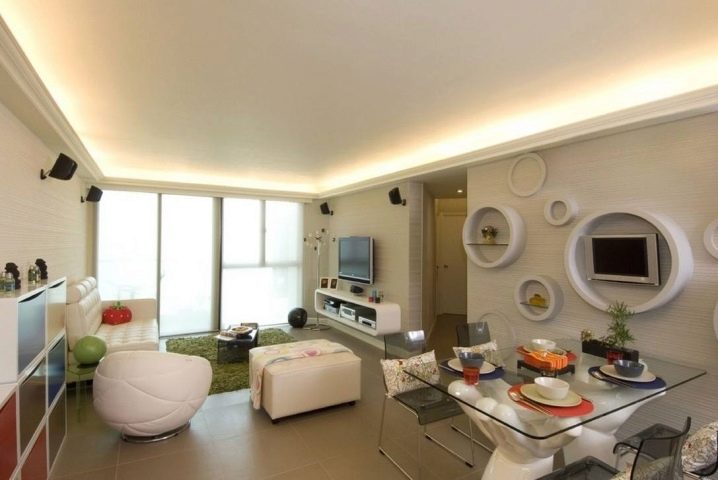 - باستخدام الإضاءة الخلفية. هذه الطريقة أصلية تمامًا وتتيح لك خلق جو رومانسي في المساء. يمكن استخدام هذا الحل كإضاءة إضافية. تجدر الإشارة إلى أن الإضاءة الخلفية ستكون مفيدة وجميلة لتسليط الضوء على العناصر الموجودة على الرفوف. من المهم أن نفهم أن الضوء يجب أن يوجه إلى الحائط أو الأرضية ، ولكن ليس إلى الغرفة أبدًا. وبالتالي ، لن يعمى ، لكنه “يزحف” بسلاسة حول الغرفة. كحل تصميم غير عادي ، يمكن استخدام خيوط نيون متعددة الألوان. سيؤدي هذا إلى تغيير الغرفة في الليل. ولكن إذا كنت بحاجة إلى ظل أكثر راحة ، فاختر لونًا أبيض دافئًا ، والذي يعتبر مألوفًا للعين. بفضل اللون الأصفر ، يتم إنشاء جو مريح وعائلي ، وهو أمر لا غنى عنه بعد يوم شاق في العمل ، عندما يرغب الشخص في الاسترخاء. إذا كانت هناك حاجة لتقليد ضوء النهار ، فسيتم استخدام مصباح أبيض مع مسحة باردة لهذا الغرض. في هذه الحالة ، لا تتشوه ألوان الأشياء ، لكن العيون لا ترتاح تمامًا..