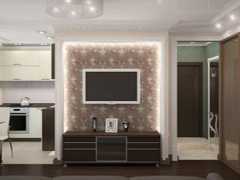 يجب أن تعلم أن مكانه سيصبح جزءًا لا يتجزأ من الداخل. لذلك ، يجب التعامل مع تصميمه بجدية وإبداع. من المهم أن نفهم أن التلفزيون سيكون في قلب كل شيء. لهذا السبب يجب تجنب التفاصيل الزاهية والملونة. خلاف ذلك ، ستندمج الصورة على شاشة التلفزيون مع الحائط الرئيسي..