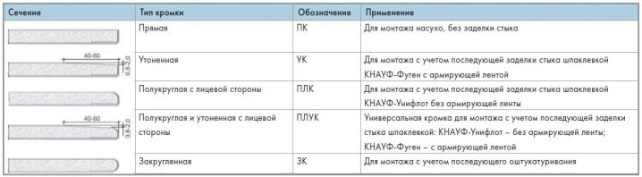 يمكن أن تكون الحافة الطولية للوح الجصي مختلفة ، على سبيل المثال ، أقل سمكًا من اللوح الرئيسي ، مما سيسمح لك بتثبيت المفاصل بجودة عالية. الحافة المائلة أو المستدقة مناسبة للتشطيب ، وعند تركيب عدة طبقات من ألواح الجبس ، من الأفضل اختيار حافة مستقيمة قياسية. يشار إلى نوع الحافة على العبوة.
