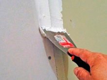 - نقوم بمعالجة اللحامات. نضع المعجون على المفصل ونحدده بملعقة ، ونطبق شبكة تقوية في الأعلى. بعد التجفيف ، من الضروري وضع طبقة أخرى من المعجون وتسويتها ومسحها.