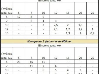 يتم حساب استهلاك المواد باستخدام الصيغة التالية: عرض المفصل مضروب في العمق. إذا كان المفصل على شكل مثلث ، يتم تقسيم النتيجة على اثنين. بناءً على تقييمات المستهلكين المتاحة ، يمكن ملاحظة أن أسطوانة 0.3 كجم من مادة مانعة للتسرب كافية لمعالجة عشرة أمتار من قاعدة العمل بقياس 5 × 5 سم.