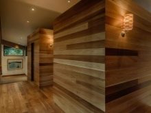 لاحظ المصممون على مستوى عالٍ الخشب بسبب ظلاله المتعددة. يتيح التنوع الغني اختيار الخيار المثالي اعتمادًا على النمط الداخلي والتفضيلات الشخصية. على الرغم من الاسم ، يستخدم الأرز الأحمر الكندي في صناعة البطانة بظلال ذهبية..