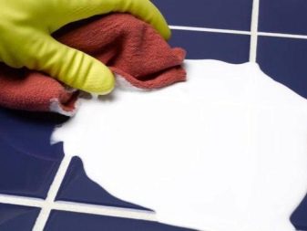 في الحالات التي يتعذر فيها إزالة الأوساخ من البلاط بالطريقة الأولى ، أو إذا كنت لا تريد المخاطرة وخدش الكسوة ، يوصى باستخدام عوامل كيميائية. في أغلب الأحيان ، يتم استخدام العديد من المذيبات المتاحة لهذه الأغراض ، على سبيل المثال ، الأسيتون أو الروح البيضاء..