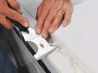 من الضروري في بعض الأحيان إزالة بقايا المادة المانعة للتسرب ليس فقط مع الإهمال في التعامل مع الأسطوانة. بعد عدة سنوات ، تبدأ طبقات السيليكون في البطانة الخزفية للحمام أو المطبخ في التدهور ، وتتسخ ، وتفقد خصائصها المانعة للتسرب والمقاومة للماء. في هذه الحالة ، تتم إزالة التماس القديم باستخدام إحدى الطرق المقترحة. يتم تنظيف السطح جيدًا وإزالة الشحوم منه. بعد ذلك ، يتم تطبيق طبقة منع تسرب جديدة.