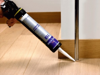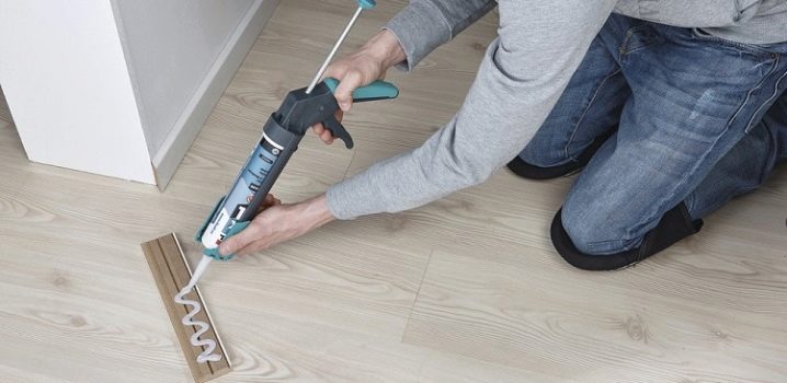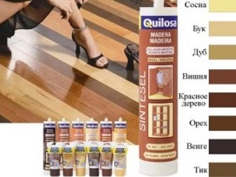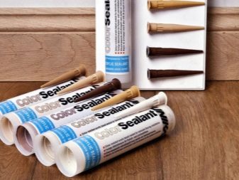 بالنسبة للأرضيات الخشبية ، فإن الأمر يستحق استخدام نوع شفاف من مادة لاصقة مانعة للتسرب. للعمل مع الأرضيات (أرضيات باركيه ، شرائح) ، يوصى باختيار نغمات أغمق لن تكون ملحوظة بعد التجفيف..