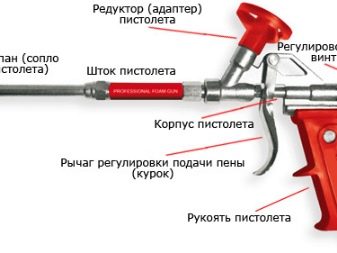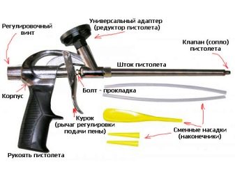بالإضافة إلى ذلك ، يتضمن بناء مسدس الرغوة الزناد ، وهو الزناد. إن سحب الزناد هو الذي ينشط الآلية بأكملها ، ونتيجة لذلك يتم إطلاق الرغوة من البالون. يتضمن المسدس أيضًا قبضة يمكن أن تكون مصنوعة من البلاستيك أو المعدن. من الضروري أن تمسك الأداة في متناول اليد..