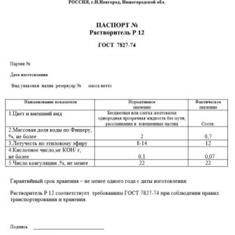وصف المذيب R-12 مشابه لوصف أي منتج آخر مشابه تقريبًا. هذا سائل ذو رائحة واضحة ، نفاذة ، كريهة ، استنشاق أبخرته تشكل خطرا على الصحة. إنه متجانس ، ولا ينبغي أن يحتوي على شوائب مرئية في شكل الرواسب. المذيب شفاف (عديم اللون) أو مسحة صفراء طفيفة.
