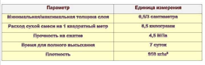 - تختلف القيم المسموح بها لسمك طبقة التسوية للجدار من 5 إلى 50 مم ، للأسقف – من 5 إلى 15 مم. السماكة الموصى بها هي 10 مم ؛