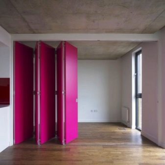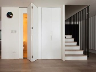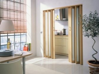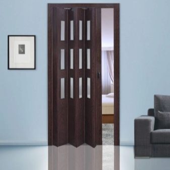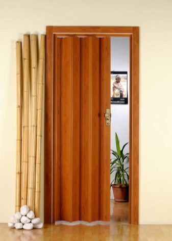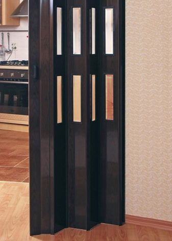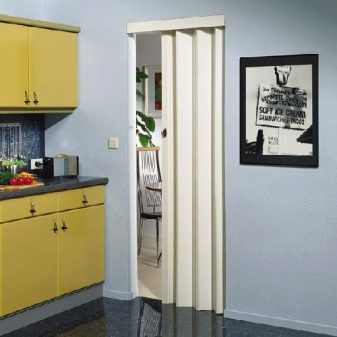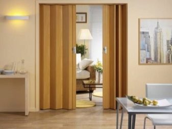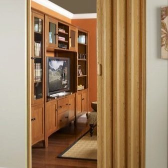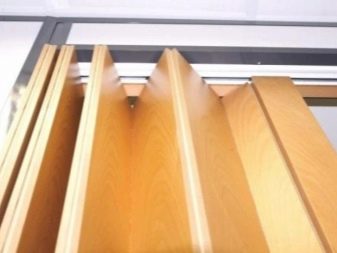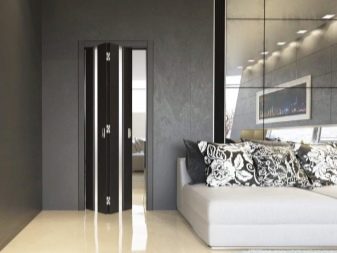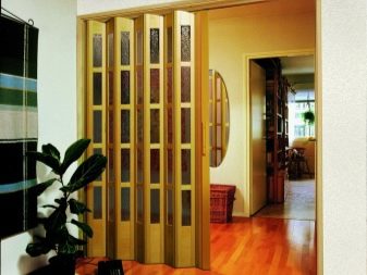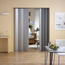 كقاعدة عامة ، هذه ليست هياكل مضغوطة صلبة للغاية. هذا هو السبب في أنها لا تعتبر موثوقة مثل الأبواب القابلة للطي. تبدو هذه الأبواب سخيفة بعض الشيء في الغرف الكبيرة والواسعة للغاية ذات المداخل الواسعة ، حيث تحتوي على عدد كبير من الأقسام. لذلك ، فهي أكثر ملاءمة للتركيب في الممرات القياسية أو الضيقة..