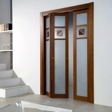 - خشب. النماذج الخشبية هي الأثقل وزنًا ، لكنها أنيقة المظهر. كقاعدة عامة ، الأبواب المطوية مصنوعة من الخشب ، لأن هذه هياكل أكثر ضخامة. تبدو الأبواب الخشبية المصفحة أنيقة للغاية. علاوة على ذلك ، يمكن أن يحتوي هذا الباب على هيكل خشبي صلب ولوحة قماشية بإدخالات مختلفة..