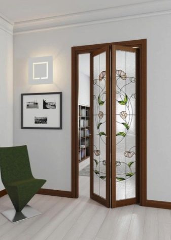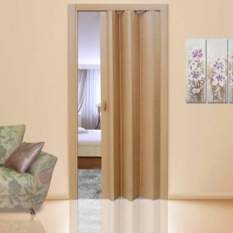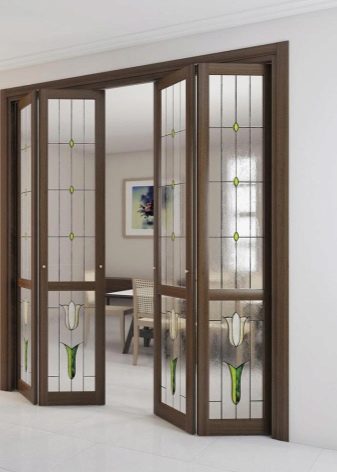 - تبدو الأبواب القابلة للطي أكثر أصالة. خلاف ذلك ، تسمى هذه المنتجات “الأكورديون”. تتكون هذه الهياكل من عدة أبواب ضيقة ، مثبتة مع مفصلات خاصة. هذه الأبواب متصلة بالصندوق الأساسي بمفصلات عادية. عندما تفتح هذه التصميمات ، تنزلق اللوحات بشكل جيد إلى الجانب. ومع ذلك ، فإن العديد من المشترين يسلطون الضوء على استحالة تركيب الأقفال أو المزالج باعتبارها عيبًا في “الأكورديون”.
