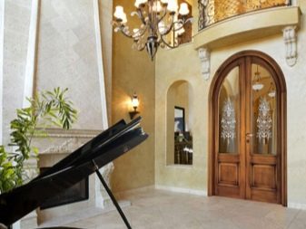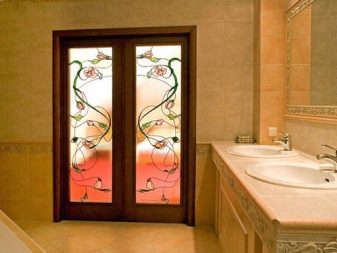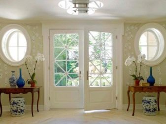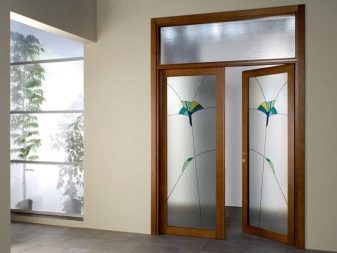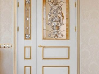 غالبًا ما يستخدم الزجاج المعشق كإدراج ، مصقول وفاخر. لتعزيز الانطباع ، تم تثبيت قوس نصف دائري مزين بنفس العناصر الزجاجية فوق إطار الباب. غالبًا ما يعكس لون ورقة الباب والتجهيزات صدى الظلال الموجودة في الأثاث..